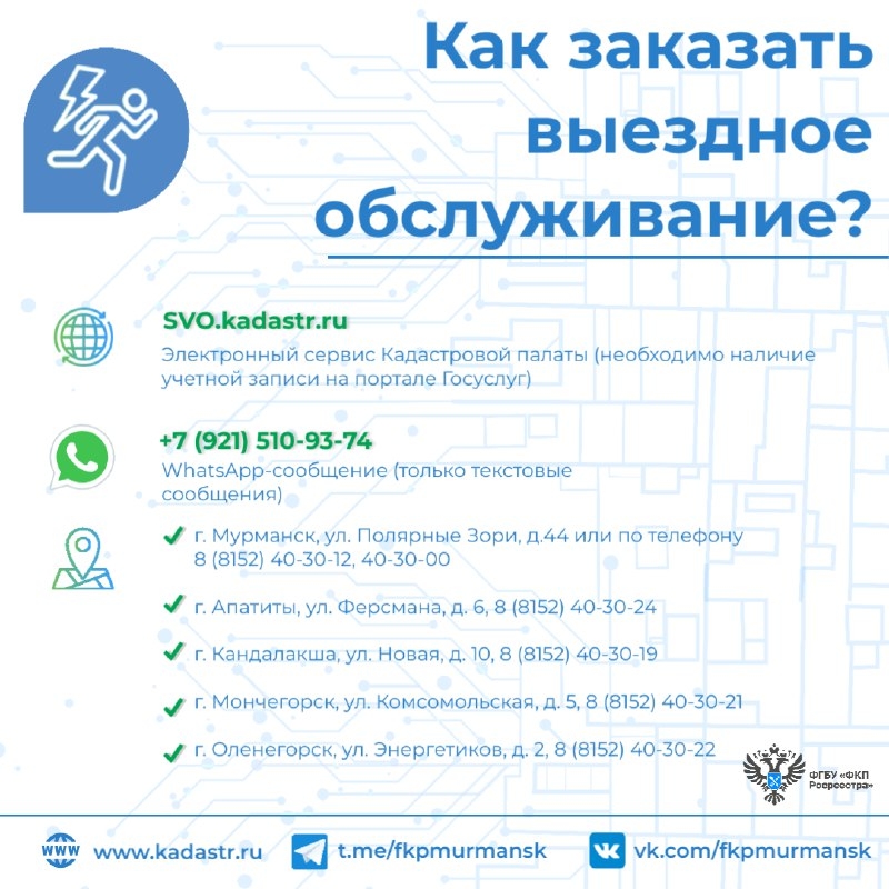 Заказать услугу выезда специалиста можно онлайн с помощью электронного сервиса svo.kadastr.ru, в офисах Кадастровой палаты или по телефону:
