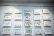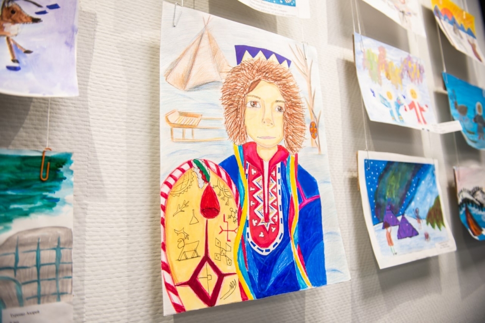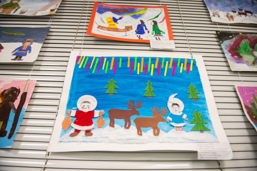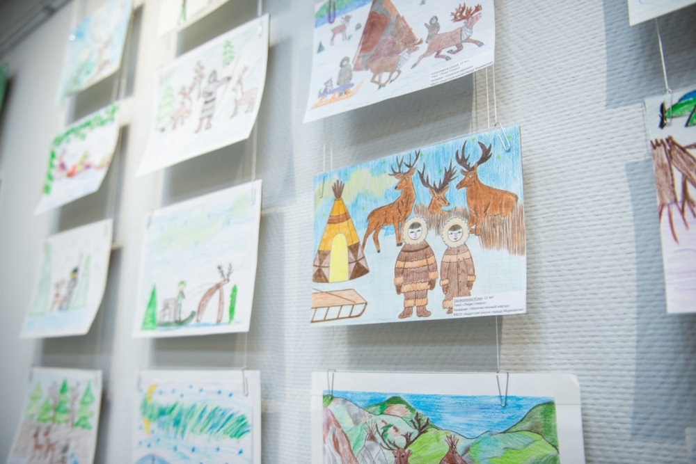 В экспозицию вошли фотопортреты ветеранов и лучшие работы городского конкурса детских рисунков "Мой Мурманск - повелитель кораблей", посвящённые истории Кольского полуострова и жизни саамов в мирное время.