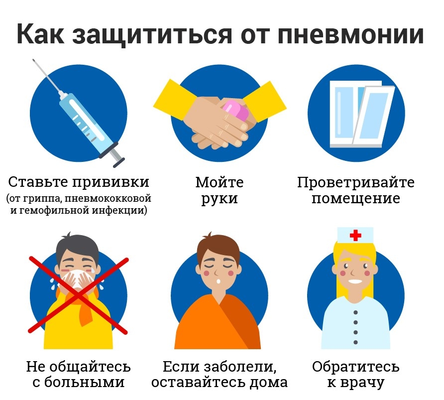 В целях профилактики внебольничной пневмонии соблюдайте гигиену рук. Мойте руки водой с мылом как можно чаще, особенно после кашля или чихания. Также эффективными являются средства для обработки рук на основе спирта. Прикрывайте рот и нос бумажной салфеткой во время кашля или чихания. Если у вас нет салфетки, при кашле или чихании прикрывайтесь локтем или плечом, а не руками.