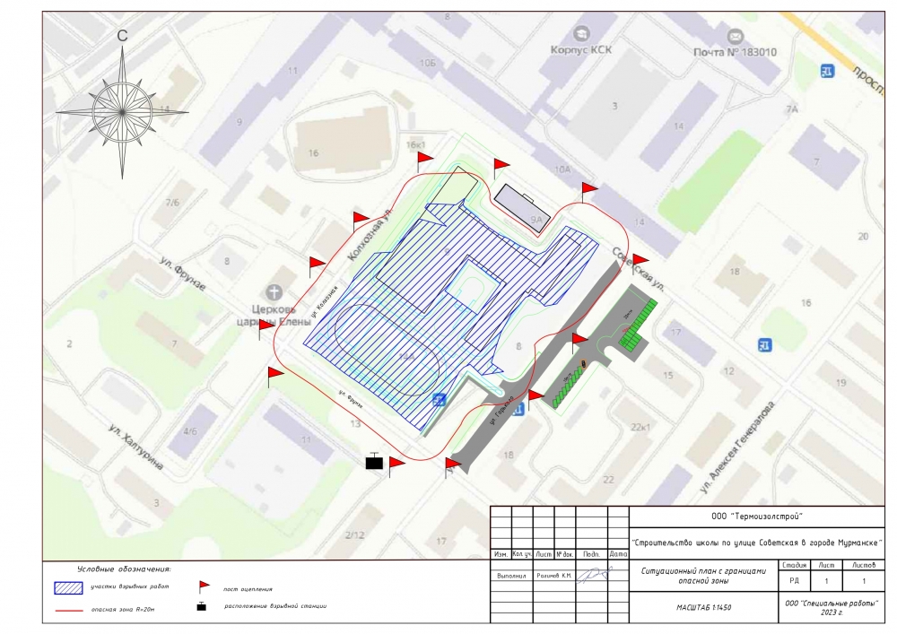 Уточнены схемы производства взрывных работ при строительстве объекта «Школа по улице Советская в городе Мурманске». ООО «Специальные работы» уведомляет о том, что при строительстве объекта с 21 по 24 марта 2023 г с 17.00 до 19.00 (резервное время с 11.00 по 13.00) запланировано производство взрывных работ. Взрывы осуществляются с применением укрытий из металлических листов, предотвращающих разлет осколков скальной породы. Проводимые работы не представляют опасности для населения.