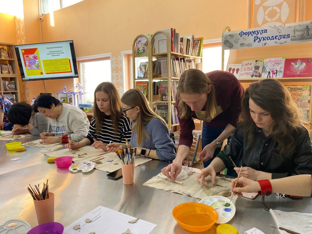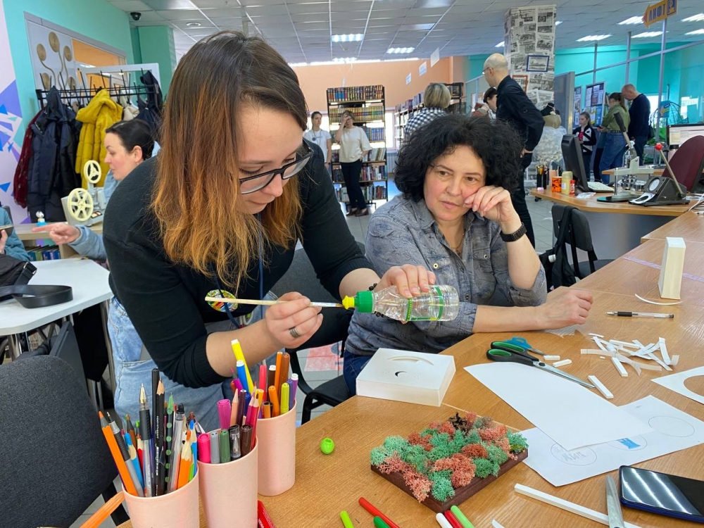 Так, гости Арт-библиотеки - информационного интеллект-центра филиала № 9 Центральной городской библиотеки (ул. Карла Маркса, 29) - стали участниками разнообразных мастер-классов. Они научились создавать творческие изделия своими руками: расписывать деревянные значки, мастерить световую панель в технике бумажный туннель, магнит из фоамирана, освоили плетение браслета из бусин и изготовили настенное панно из природных материалов, стабилизированного мха и эпоксидной смолы.