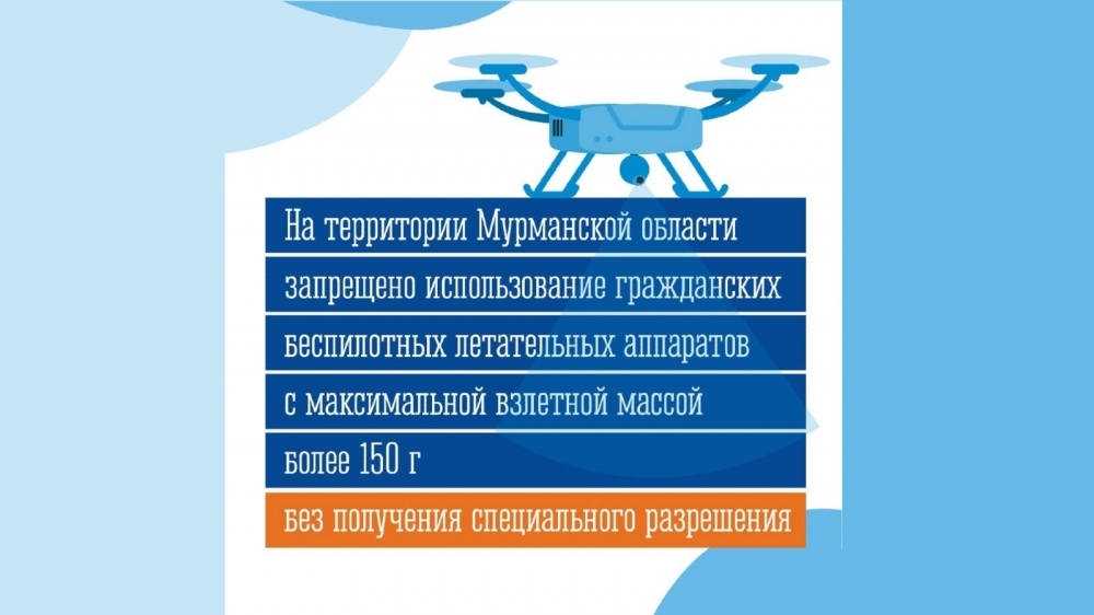 В соответствии с постановлением Губернатора Мурманской области от 10.04.2023 № 39-ПГ запрещено использование беспилотных гражданских воздушных судов с максимальной взлетной массой от 0,15 килограмма, ввезенных в Российскую Федерацию или произведенных в Российской Федерации (далее — БВС), на территории Мурманской области, за исключением БВС, используемых: