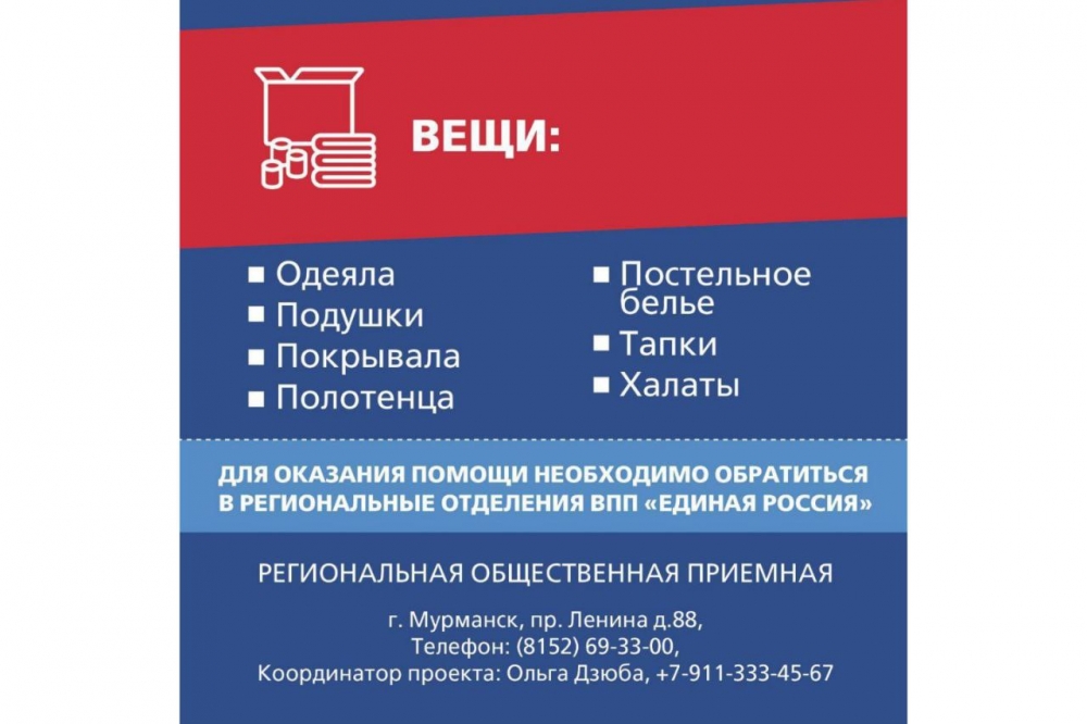 Сбор гуманитарной помощи для жителей Белгородской области продолжается. В Мурманске ее принимают в региональной общественной приемной партии «Единая Россия» (просп. Ленина, 88) и в региональном исполнительном комитете партии «Единая Россия» (ул. Софьи Перовской, 17, офис 424).