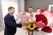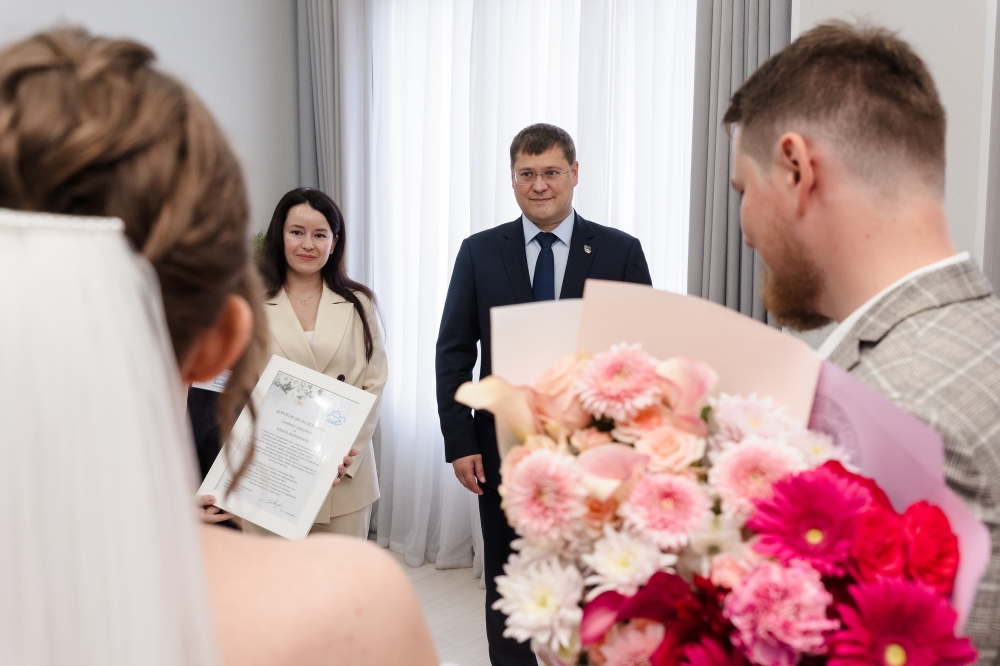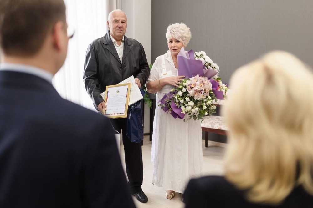 В мурманском ЗАГСе состоялось бракосочетание молодых мурманчан Даниила и Алины Минкиных. Вторая пара - Вячеслав и Раиса Урванцевы - в этот праздничный день в торжественной обстановке семья отметила золотой юбилей совместной жизни.