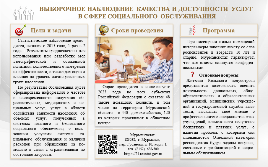 В рамках системы федеральных статистических наблюдений по социально-демографическим проблемам с 19 июля по 7 августа 2023 года на территории Мурманской области пройдет выборочное наблюдение качества и доступности услуг в сферах образования, здравоохранения и социального обслуживания, содействия занятости населения.