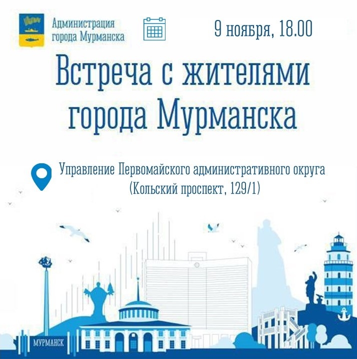 9 ноября в 18.00 в Управлении Первомайского административного округа (Кольский проспект, 129/1) состоится встреча главы администрации города Мурманска Юрия Сердечкина и главы муниципального образования город Мурманск Игоря Мораря с жителями.