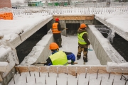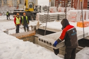 На объекте уже ведется кирпичная кладка наружных стен 2-й секции и скоро начнется прокладка тепловой сети и устройство наружных внутриплощадочных сетей водопровода и канализации. Возводятся стены 1-го этажа третьей секции, началось строительство стен в первой и четвертой секции.