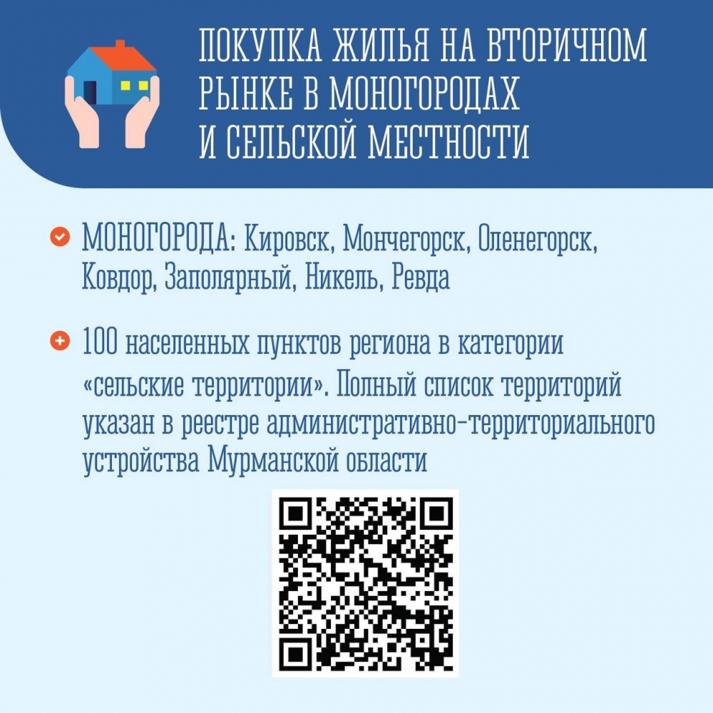 Воспользоваться льготным кредитом под 2% годовых можно для приобретения жилья на первичном рынке, в том числе для участия в долевом строительстве, и на покупку жилья на вторичном рынке в моногородах Кировске, Мончегорске, Оленегорске, Ковдоре, Заполярном, Никеле или Ревде, а также в сельских поселениях региона.