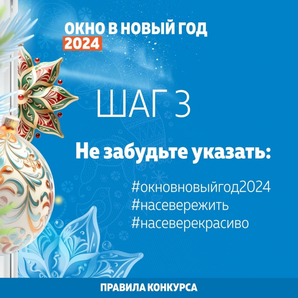 Принять участие в конкурсе «Окно в Новый год» можно до 15 января. Достаточно выложить фотографию украшенного окна на своей странице в ВК с тремя хештегами: #окновновыйгод2024 #насевережить #насеверекрасиво и заполнить заявку https://vk.com/okno2024?w=app5708398_-223473382. Ваша страница в соцсети должна быть открыта.