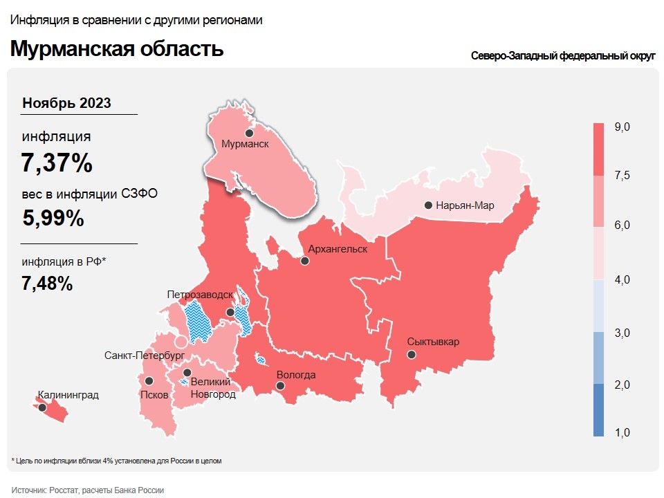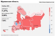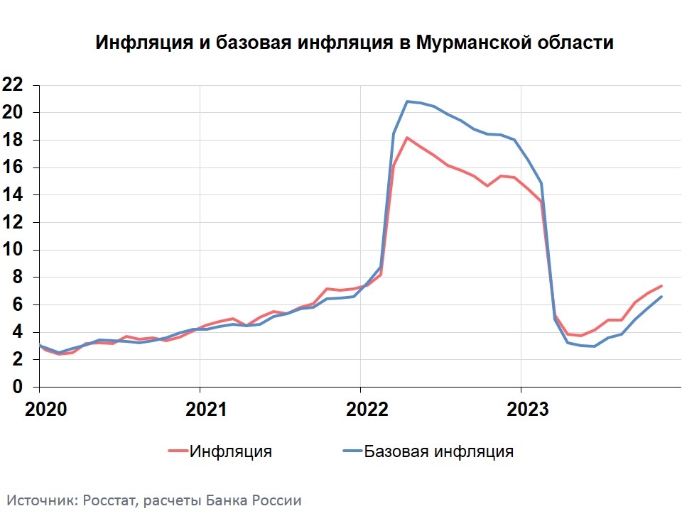 Годовая инфляция в Мурманской области в ноябре составила 7,4% после 6,8% месяцем ранее. На нее влияет прежде всего высокий потребительский спрос, который позволяет продавцам быстрее поднимать цены, компенсируя рост издержек.