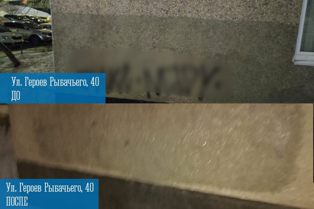 - удалены и закрашены незаконные надписи на трансформаторных подстанциях, расположенных в районе домов №176/3 по просп. Кольскому, №10 по ул. Героев Рыбачьего, №56 по ул. Героев Рыбачьего, на стене контейнерной площадки дома №40Б по ул. Героев Рыбачьего, на фасаде дома №40 по ул. Героев Рыбачьего;
