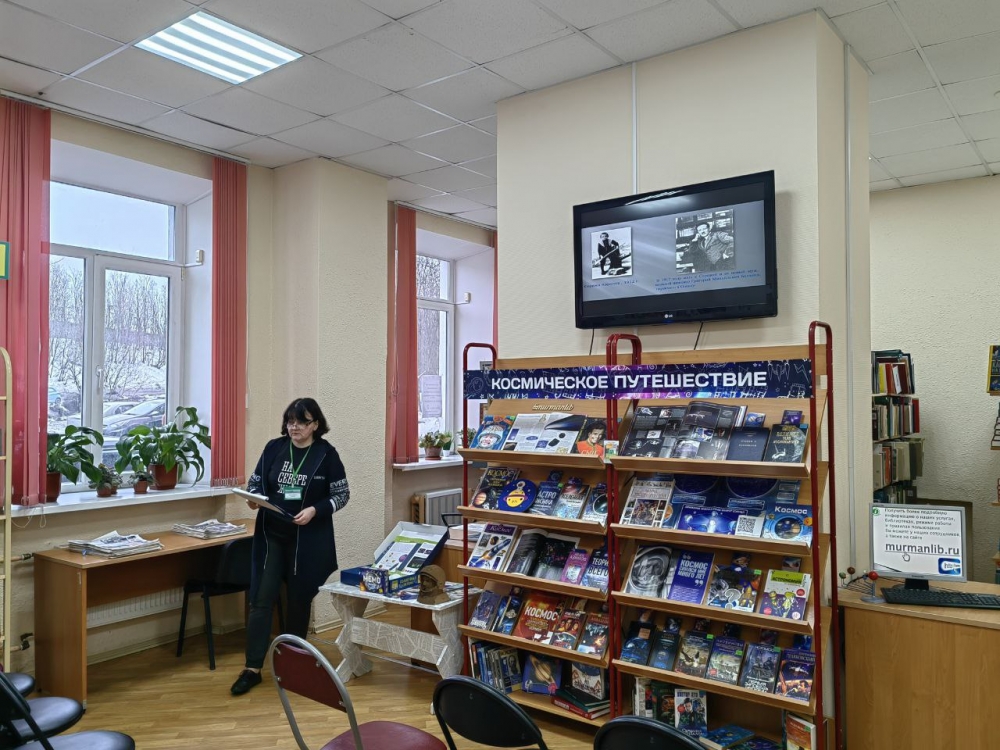 В филиале № 1 «Центральной городской библиотеки города Мурманска» (ул. Зои Космодемьянской, 9) юные читатели узнали о жизни Юрия Гагарина и об освоении космоса в целом. Вспомнили имена космонавтов и российских ученых, которые внесли неоценимый вклад в российскую космонавтику. Для ребят была подготовлена книжно-иллюстративная выставка «Космическое путешествие». Здесь же можно было ответить на вопросы викторины.