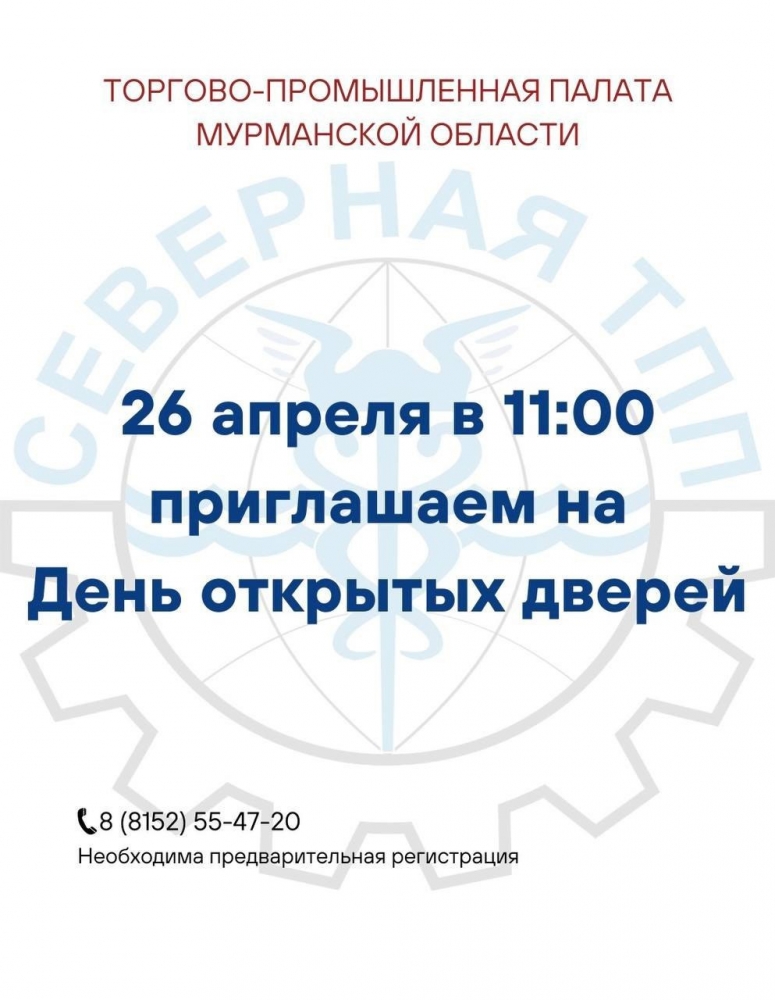 26 апреля в 11 часов состоится День открытых дверей Торгово-промышленной палаты Мурманской области. Мероприятие проводится очно и в онлайн-формате.