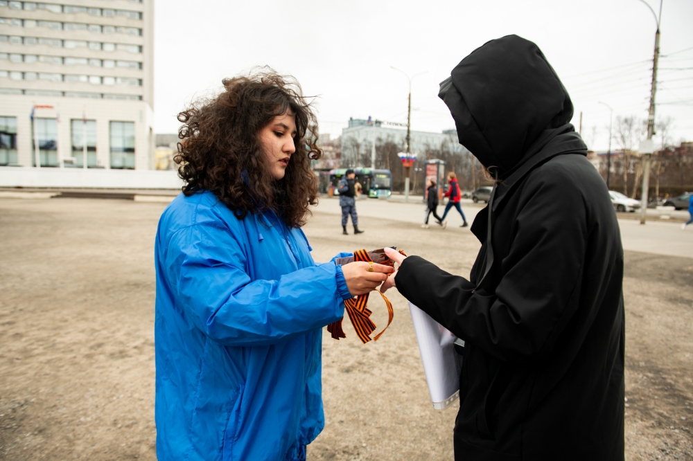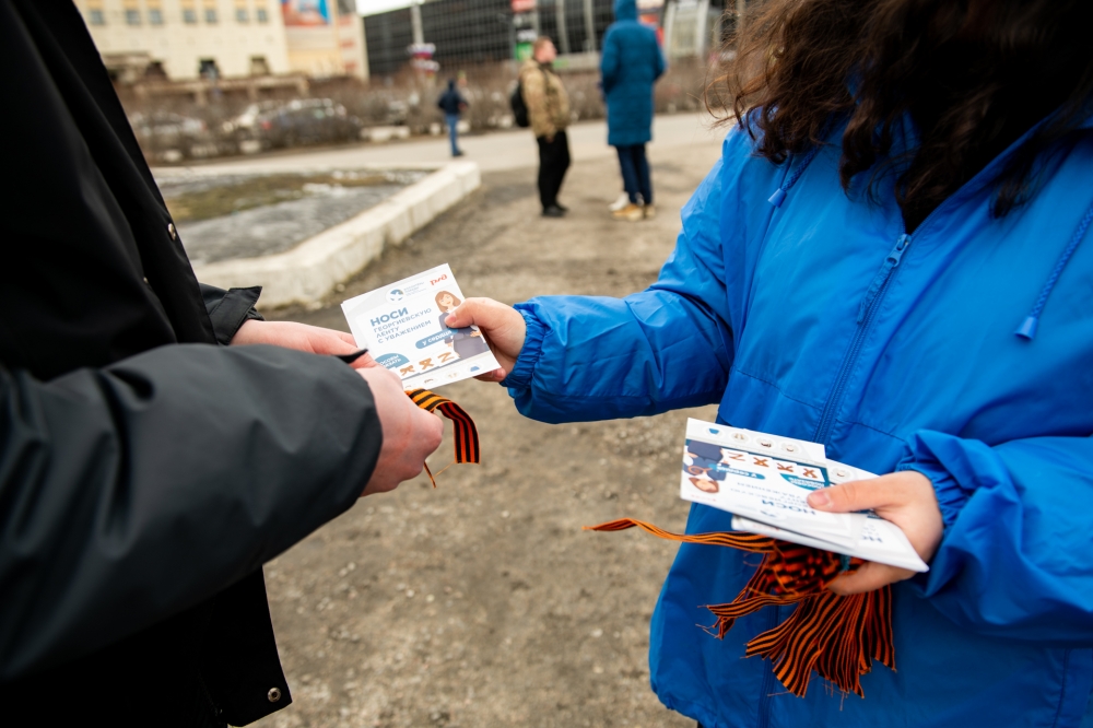 В преддверии 79-й годовщины Победы в Великой Отечественной войне активисты общероссийского движения «Волонтеры Победы» раздают мурманчанам символы праздника — георгиевские ленточки, а также буклеты с фактами из истории акции и рекомендациями о том, как лучше носить этот символ.