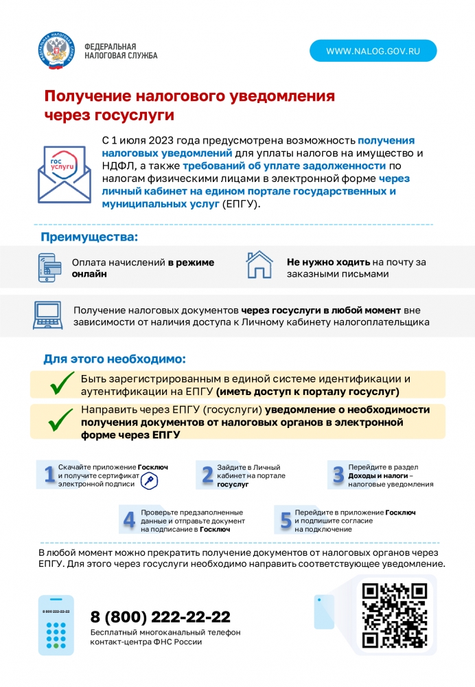 С 1 июля 2023 года предусмотрена возможность получения налоговых уведомлений для уплаты налогов на имущество и НДФЛ, а также требований об уплате задолженности по налогам физическими лицами в электронной форме через личный кабинет на едином портале государственных и муниципальных услуг (ЕПГУ).