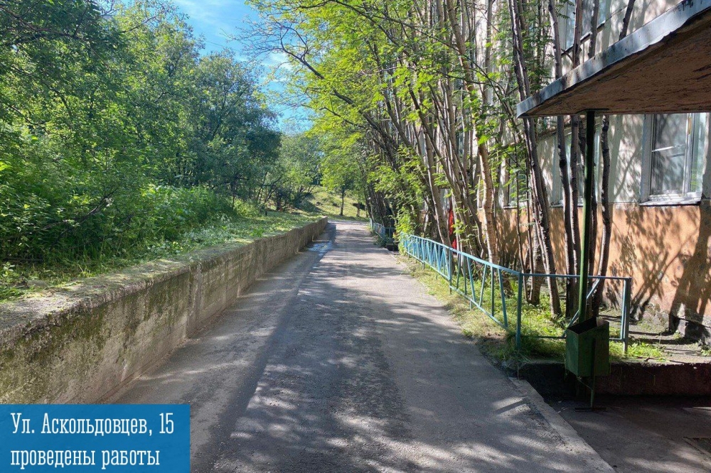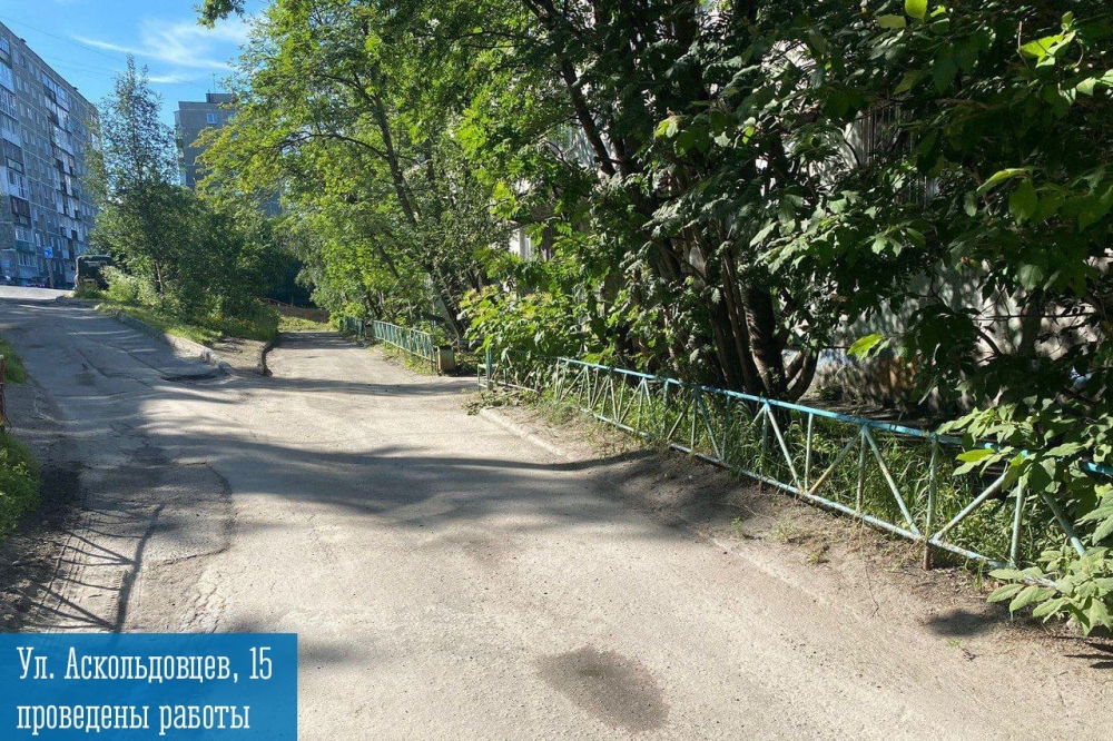 Заместитель главы Ленинского округа Павел Саенко и заместитель председателя Совета депутатов города Мурманска Ирина Андреева пообщались с жителями дома № 15 по улице Аскольдовцев. Мурманчане попросили установить скамейку у подъезда № 4, провести ремонт асфальтового покрытия дворового проезда, произвести уборку со стороны главного фасада дома № 23/35 и дворового проезда дома № 15 по улице Аскольдовцев, отремонтировать лестницу, расположенную вдоль дома. Северяне попросили произвести скос травы и очистить территорию дома № 15 по улице Аскольдовцев от мусора. Обращение отработано — траву скосили, мусор и смет убрали.