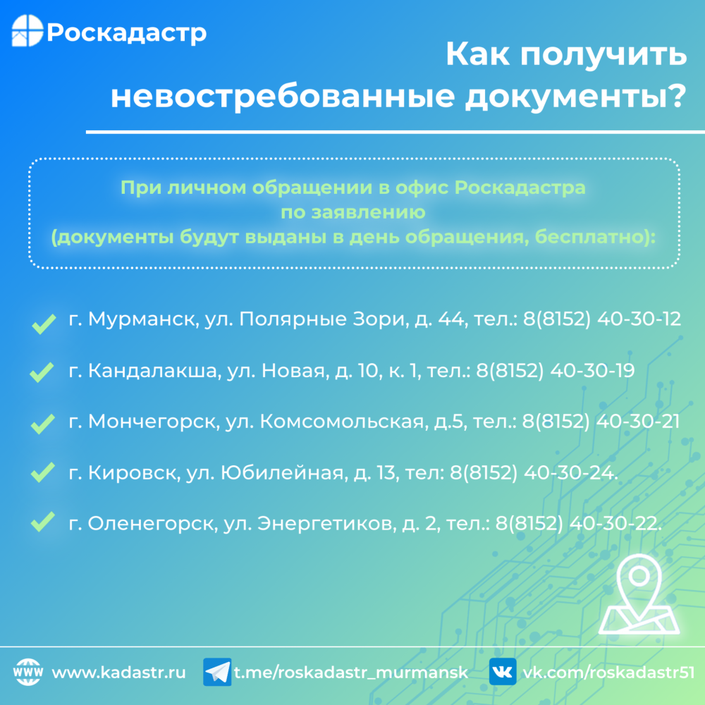 По результатам осуществления учетно-регистрационных процедур готовые к выдаче документы хранятся в офисах МФЦ 45 календарных дней. По истечении указанного срока не полученные заявителями документы считаются невостребованными и передаются на хранение в архив филиала «Роскадастр» по Мурманской области для дальнейшего хранения.