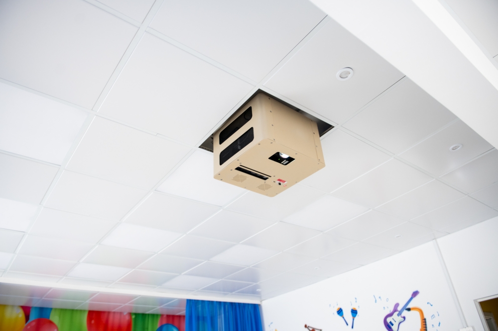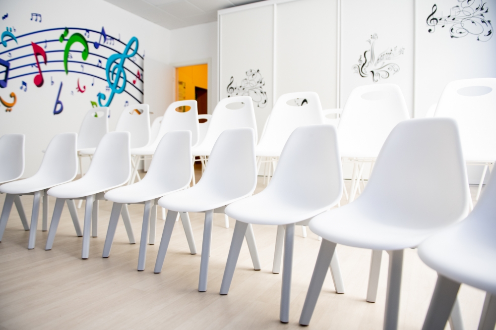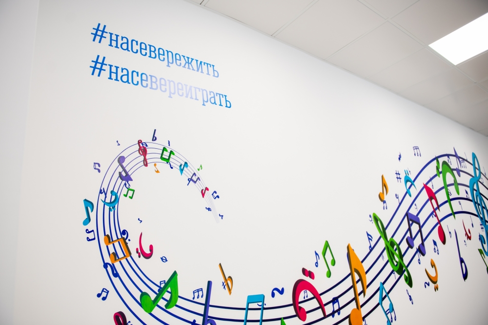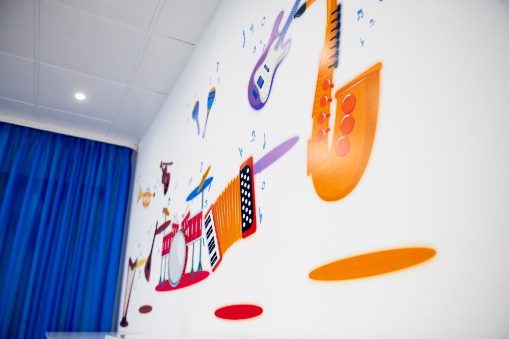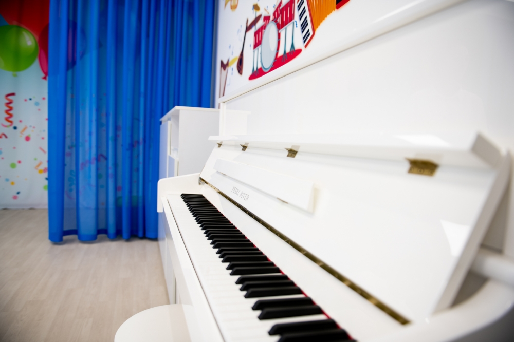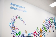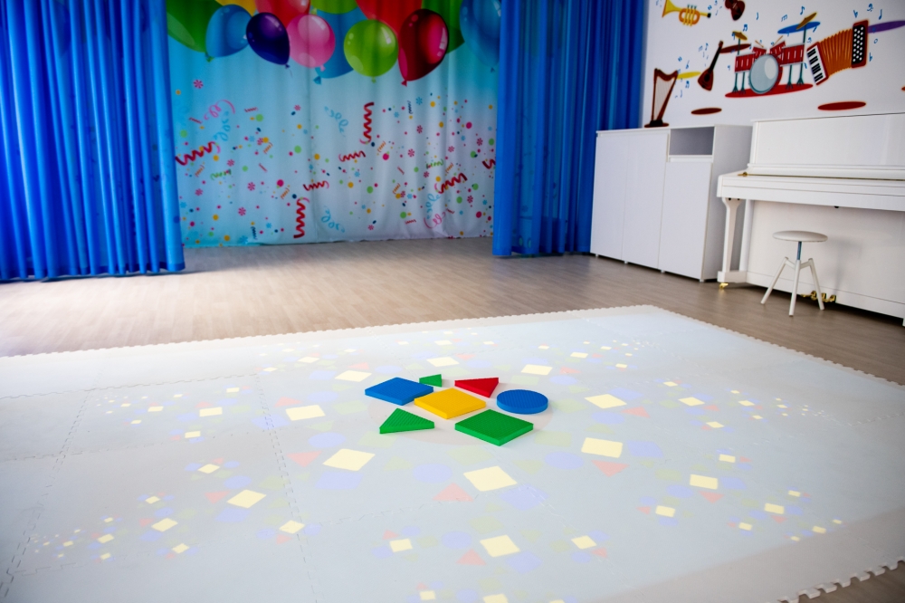 В музыкальном зале были выполнены работы по текущему ремонту стен, полов, потолков с заменой светильников и по оформлению стен интерьерным рисунком. Закуплена мебель, акустическое фортепиано, и другие инструменты, тематические занавесы, ноутбук, интерактивный комплекс с программным обеспечением «Интерактивный пол Magium».