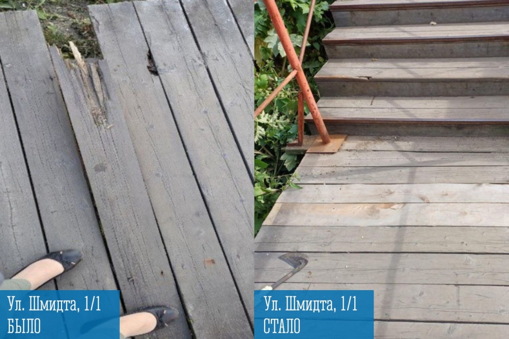 Ранее на встрече у дома № 11 по улице Шмидта северяне попросили главу округа отремонтировать уличную лестницу у дома № 1/1 и сделать заезд на придомовую территорию дома № 39/1. Работы выполнены.