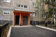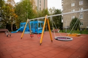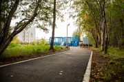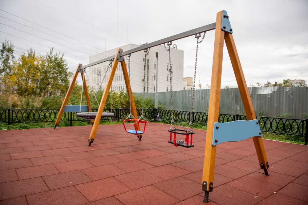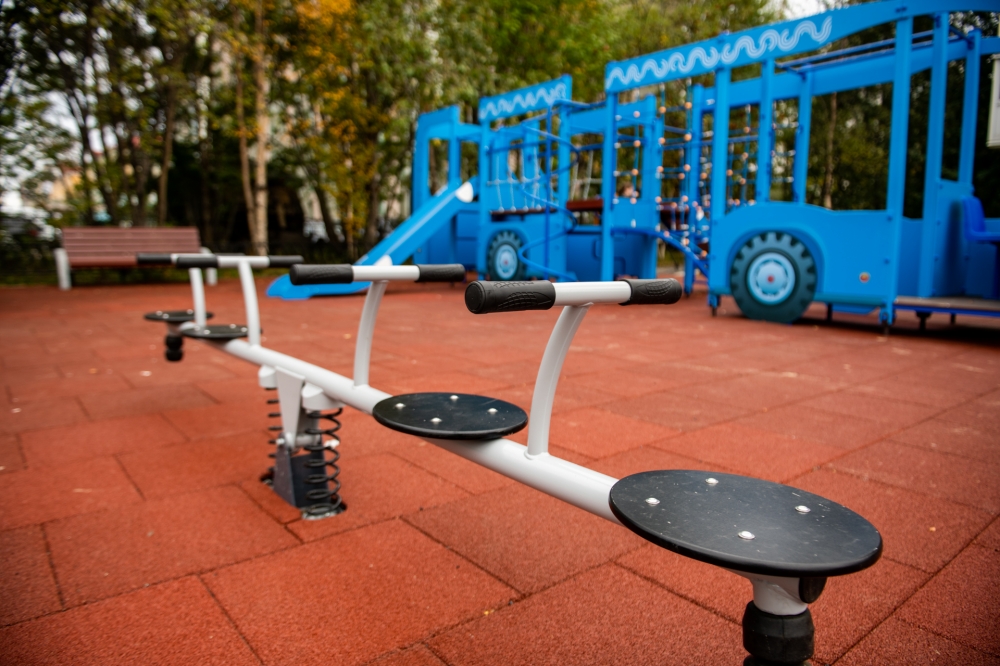 Ярким акцентом во дворе стала новая детская площадка. Помимо качелей и песочницы на ней расположился игровой комплекс в виде синего автобуса. Также на территории высажены 38 кустов черемухи в рамках компенсационного озеленения.
