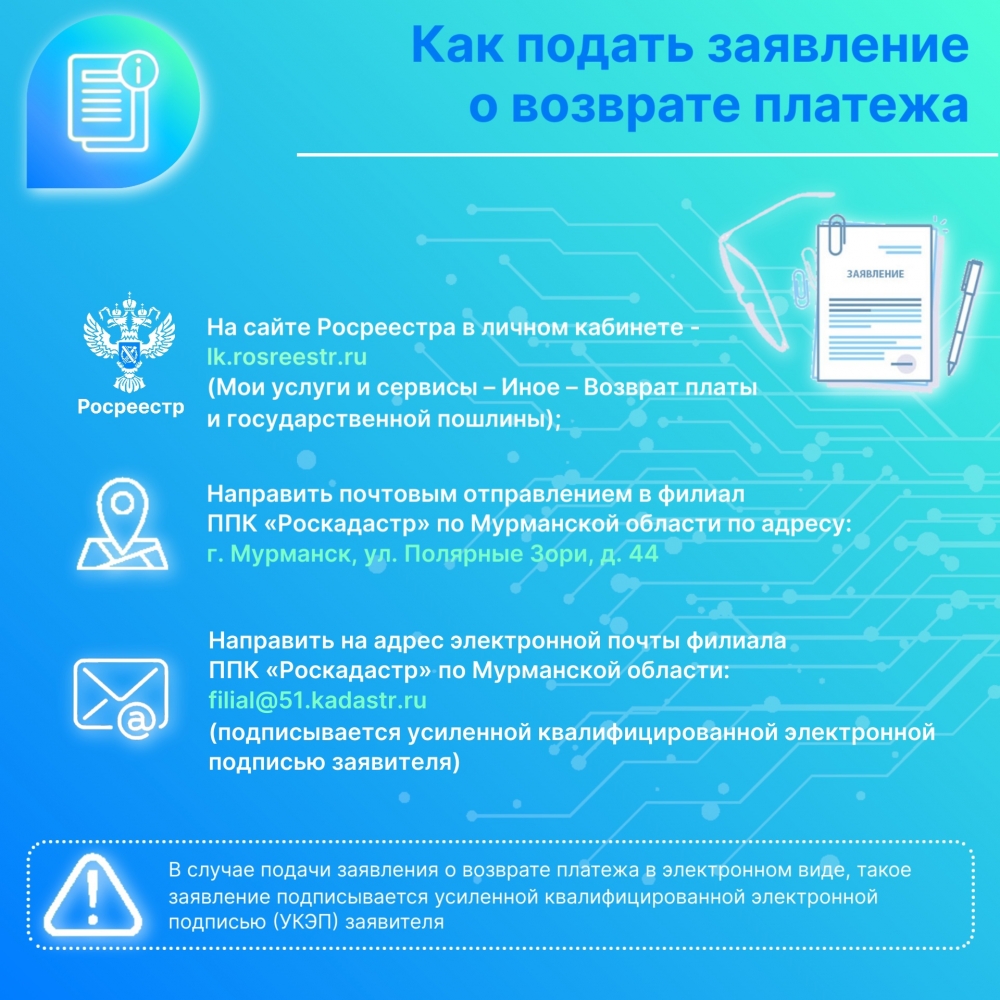 Оформить возврат может лицо, подавшее запрос на предоставление сведений, а также его представитель по доверенности. В случае подачи заявления о возврате платежа правопреемником плательщика одновременно с заявлением представляются (направляются) документы, подтверждающие переход прав требования к правопреемнику плательщика.