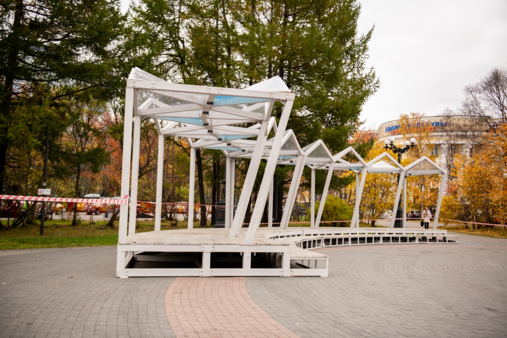 Качели с центральной площади Мурманска переезжают. Несколько секций установлены в центральном сквере, а другие вместе со скульптурой «Айсберг» будут размещены в Кольском парке.