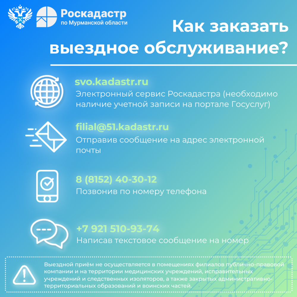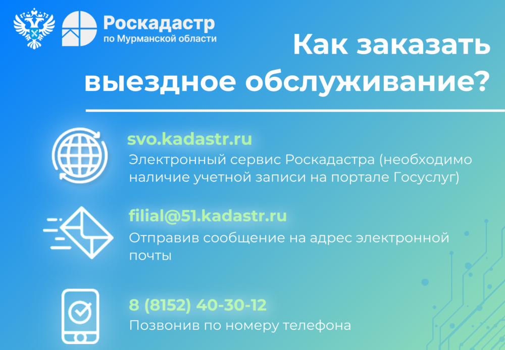 Филиал ППК «Роскадастр» по Мурманской области оказывает следующие услуги по выездному обслуживанию населения: