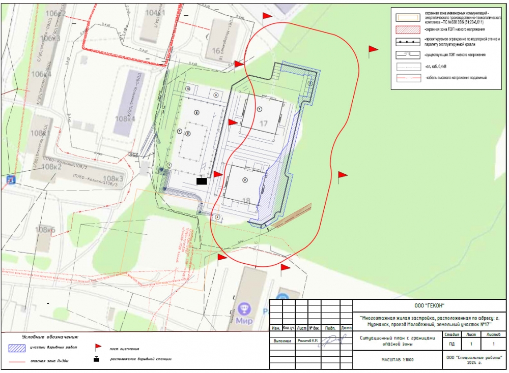 ООО «Специальные работы» информирует о том, что при строительстве объекта «Многоэтажная жилая застройка, расположенная по адресу: г. Мурманск, проезд Молодежный, земельный участок № 17» с 25 ноября 2024 года по 28 декабря 2024 года с 16.00 до 18.00 запланировано производство взрывных работ.