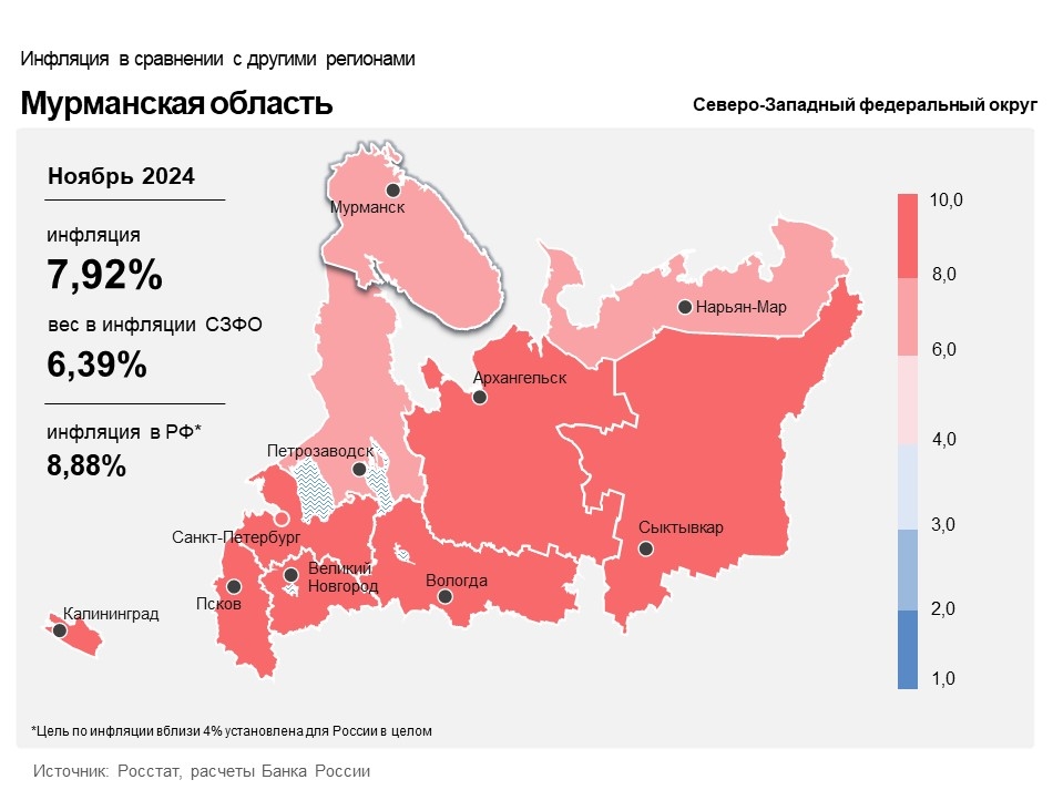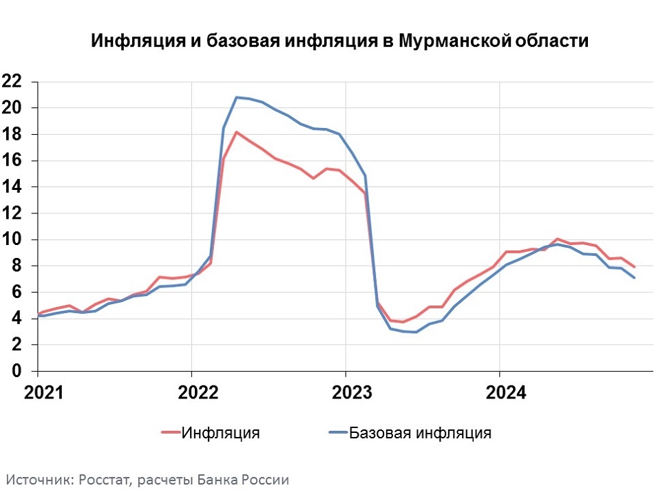 По данным Росстата, в ноябре 2024 года годовая инфляция в Мурманской области составила 7,9% после 8,6% в октябре. В регионе цены росли медленнее, чем на Северо-Западе (8,6%) и в целом по стране (8,9%).