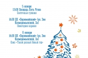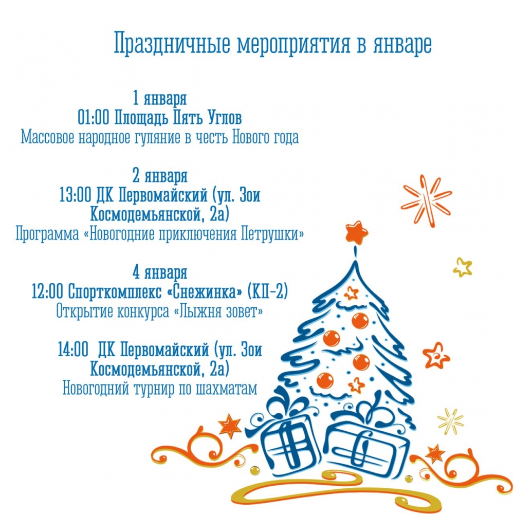 • 13:00 — ДК «Первомайский» (ул. Зои Космодемьянской, 2а) развлекательная программа «Новогодние приключения Петрушки».