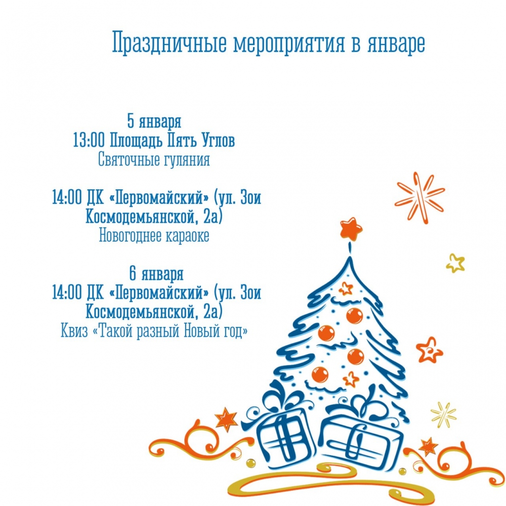 • 13:00 — Площадь Пять Углов. Святочные гуляния. Народный театр «Окрутники» в образах ряженых поздравит всех с наступившим Рождеством.
