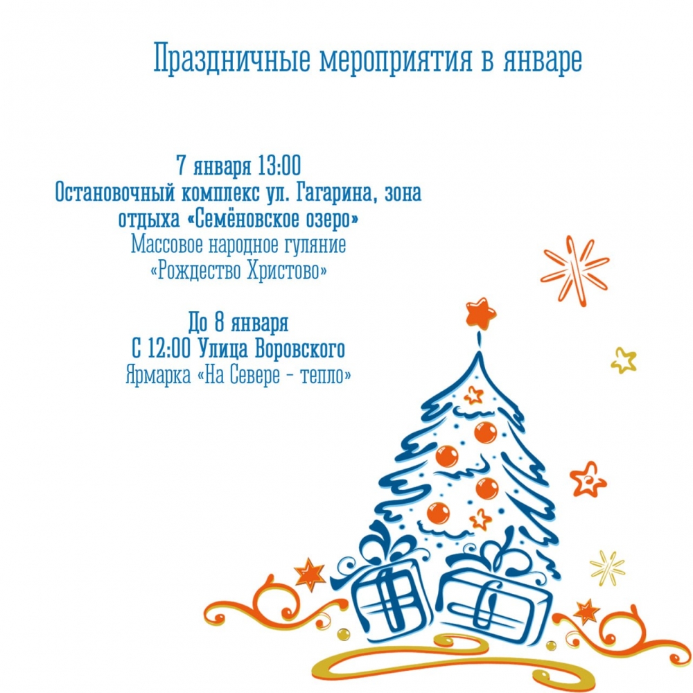 • 13:00 — Остановочный комплекс ул. Гагарина, зона отдыха «Семёновское озеро». Массовое народное гуляние «Рождество Христово». В программе игры и конкурсы для детей и взрослых, а также рождественские колядования.