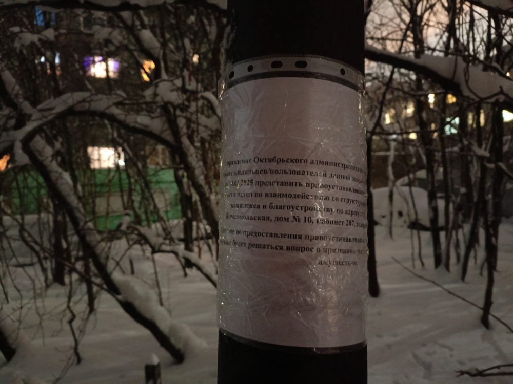 Управление Октябрьского административного округа города Мурманска просит собственника/пользователя опоры наружного освещения, расположенной на территории с дворового фасада многоквартирного дома № 16 по улице Воровского, в течение месяца (со дня опубликования объявления) представить правоустанавливающие документы на данный объект в отдел по взаимодействию со структурами жилищно-коммунального комплекса и благоустройству по адресу: город Мурманск, улица Комсомольская, дом № 10, кабинет 207, телефоны: 45-76-22, 45-06-08.