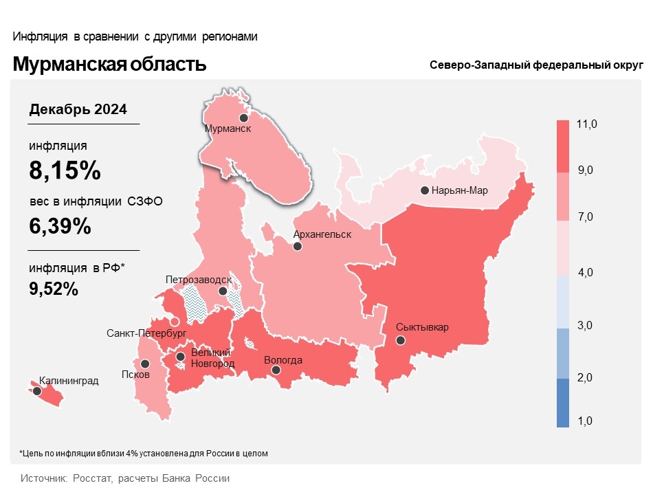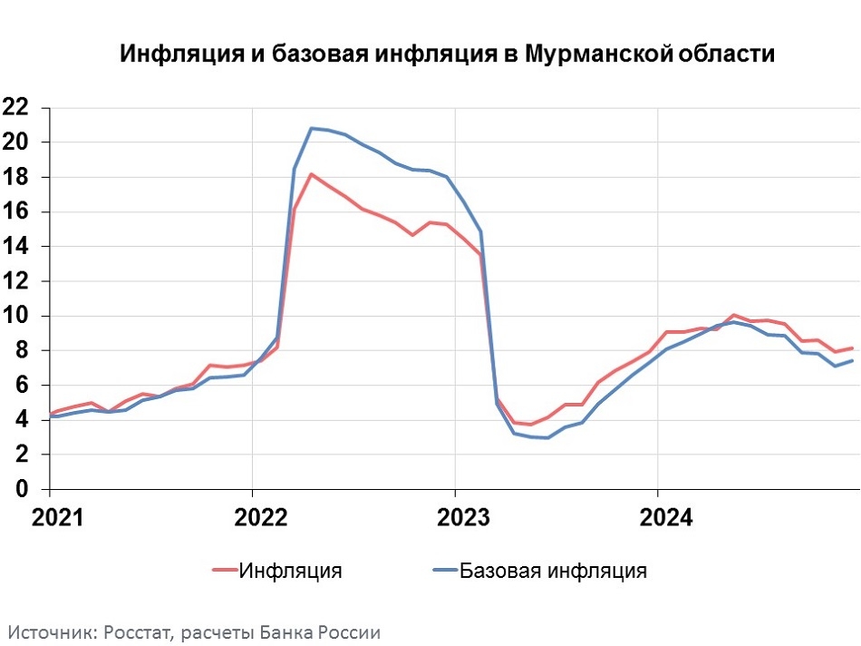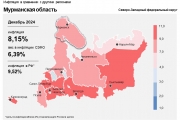 Годовая инфляция в Мурманской области в декабре ускорилась до 8,2% после 7,9% в ноябре. При этом она оставалась ниже, чем по Северо-Западу (9,3%) и в целом по стране (9,5%). Ускорился годовой рост цен на продукты и непродовольственные товары, а на услуги — замедлился.