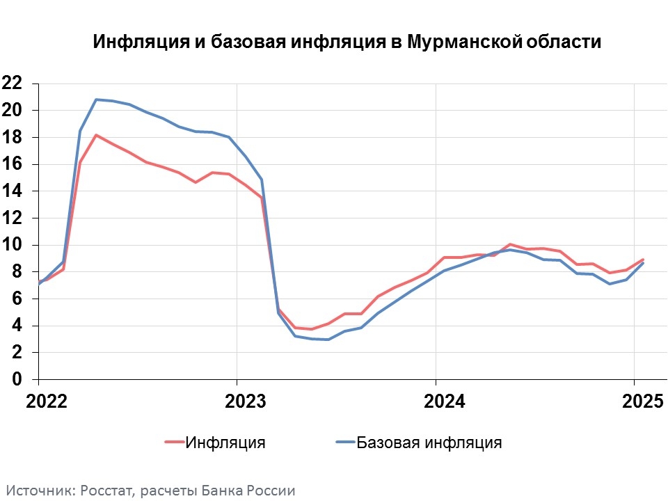 Годовая инфляция в Мурманской области, по данным Росстата, в январе 2025 года повысилась до 8,9% после 8,2% месяцем ранее. Среди основных причин — у компаний продолжили расти издержки, которые они переносили в цены.