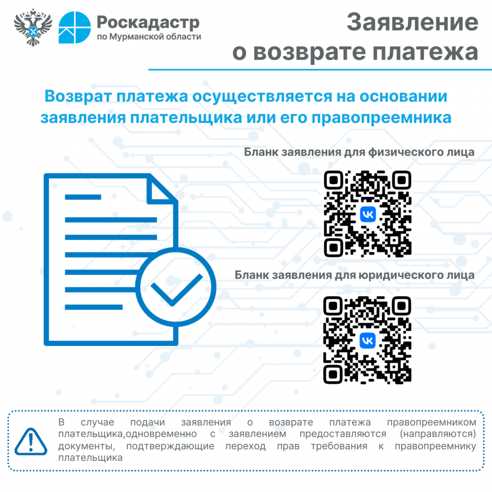 Возврат платежа осуществляется на основании заявления плательщика или его правопреемника либо на основании решения суда. В случае подачи заявления о возврате платежа правопреемником плательщика, одновременно с заявлением представляются (направляются) документы, подтверждающие переход прав требования к правопреемнику плательщика.