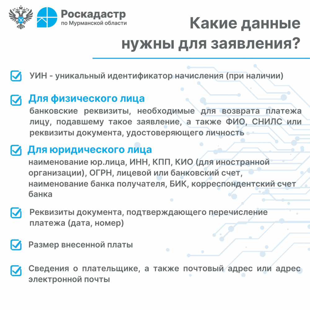 Возврат денежных средств возможно осуществить в течение трех лет со дня внесения платы. Для этого необходимо заполнить заявление, приложить подлинные платежные документы (в случае, если плата внесена в наличной форме) или копии платежных документов (в случае, если плата внесена в безналичной форме) и направить в филиал компании «Роскадастр», в который подавался запрос о предоставлении сведений ЕГРН.