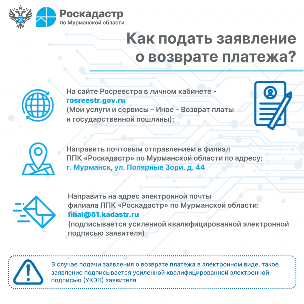 Направить заявление можно посредством почтового отправления по адресу: 183025, г. Мурманск, ул. Полярные Зори, д. 44,либо по адресу электронной почты: filial@51.kadastr. ru (в этом случае заявление должно быть подписано усиленной квалифицированной электронной подписью).