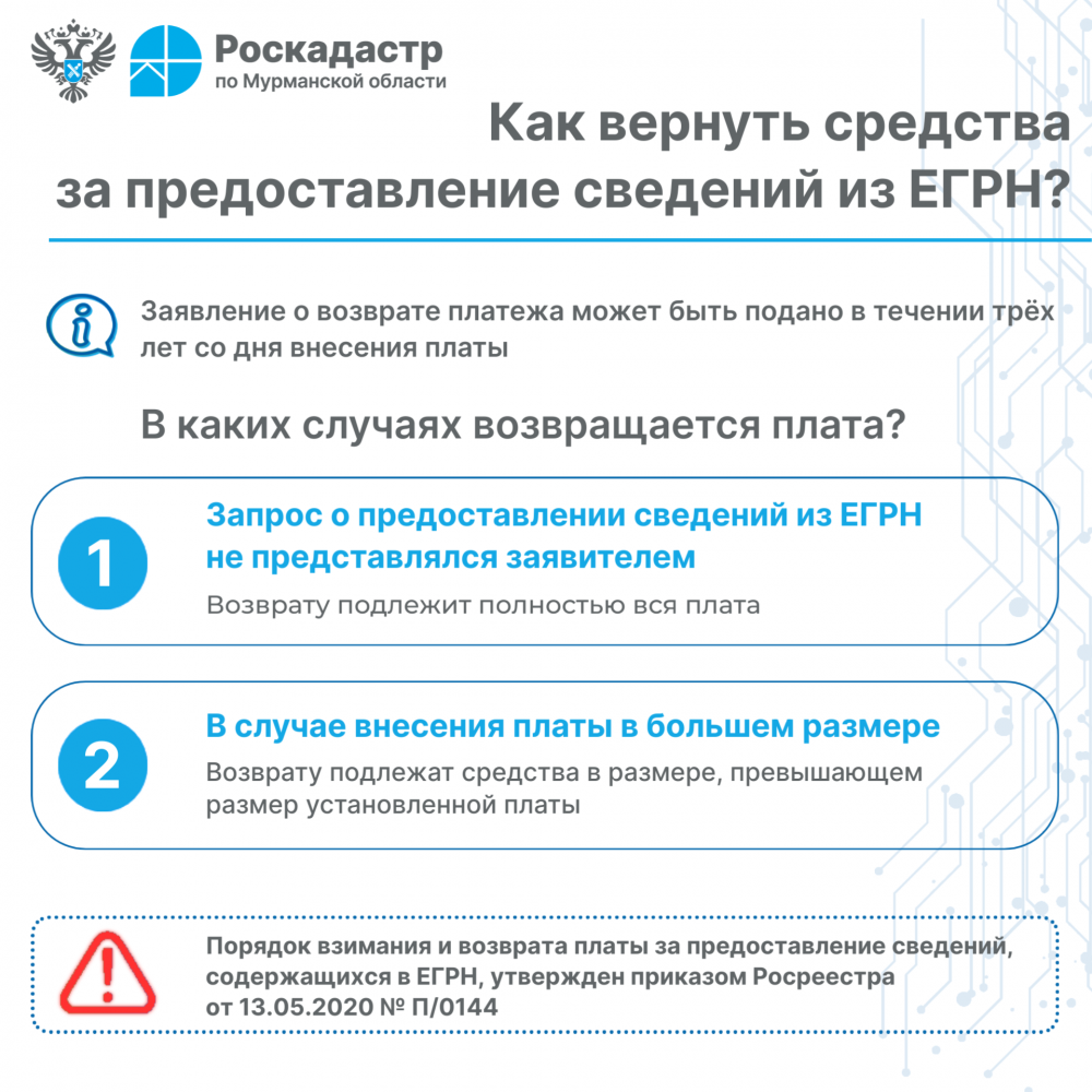 В соответствии с пунктом 11 приказа Росреестра от 13.05.2020 № П/0144 «Об утверждении порядка взимания и возврата платы за предоставление сведений, содержащихся в Едином государственном реестре недвижимости (ЕГРН), и иной информации» плата подлежит возврату в двух случаях: