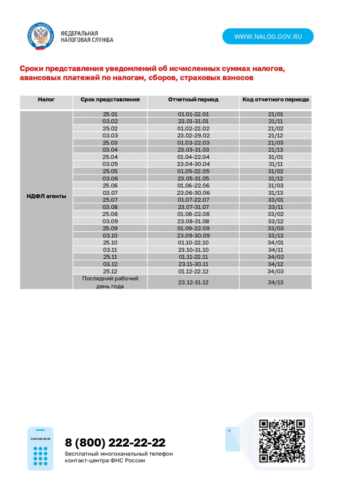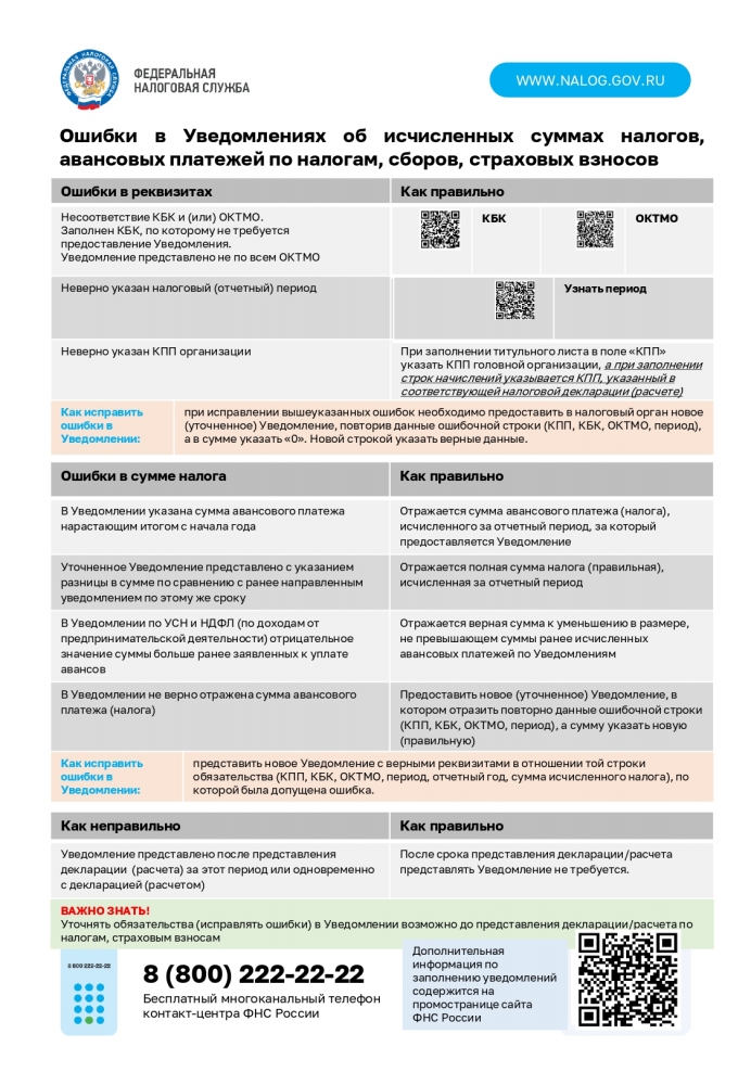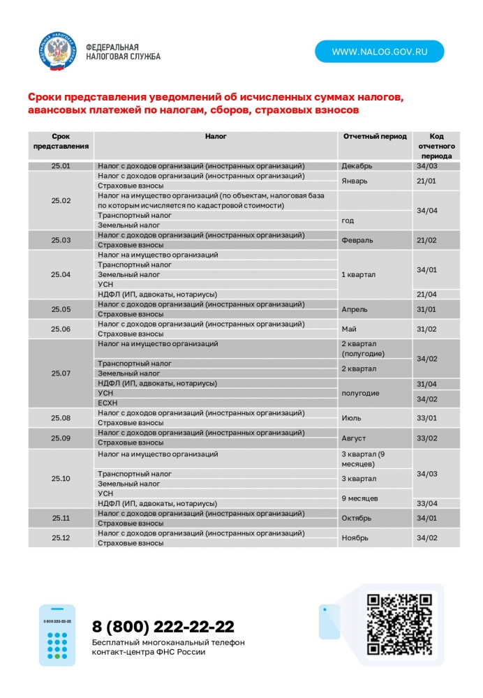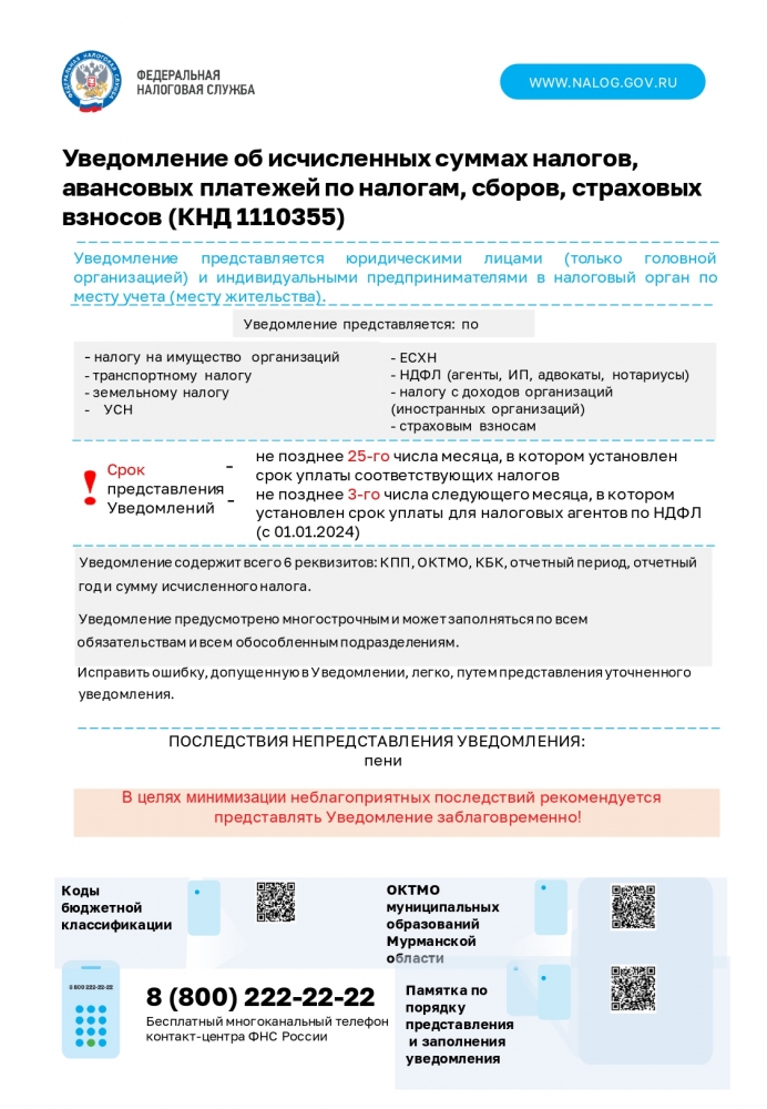 В целях своевременного исполнения обязанности по представлению уведомлений об исчисленных суммах налогов, авансовых платежей по налогам, сборов, страховых взносов плательщика Управление Федеральной налоговой службы по Мурманской области направляет памятки о сроках и порядке заполнения уведомления.