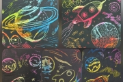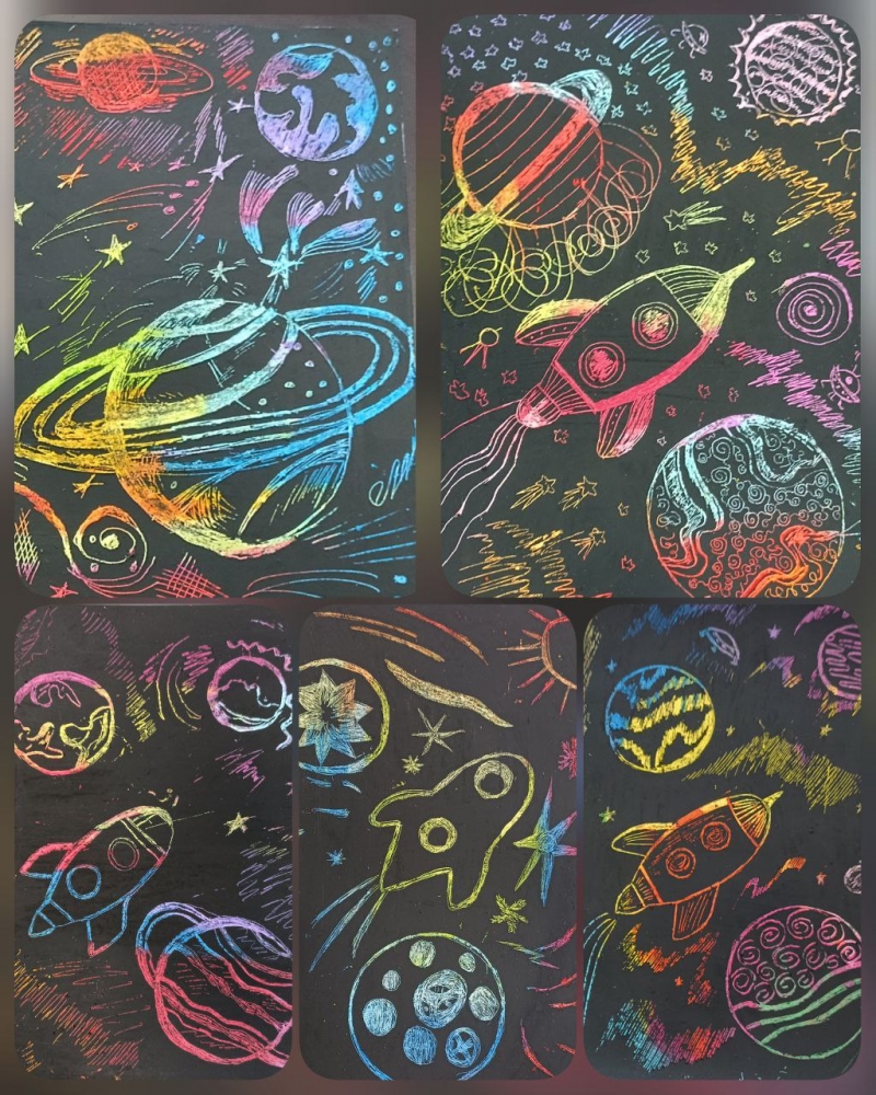 Участники проекта узнали, что название этой техники имеет французские корни и переводится как «процарапывать, царапать». Под чутким руководством талантливого педагога ДХШ Анастасии Степановой художники-любители изобразили космическое пространство, звезды и планеты. Графические средства выразительности, характерные для «граттажа», — пятно, линия и точка — органично вписались в заданную тему, а насыщенные цвета масляной пастели добавили работам колорита.
