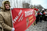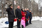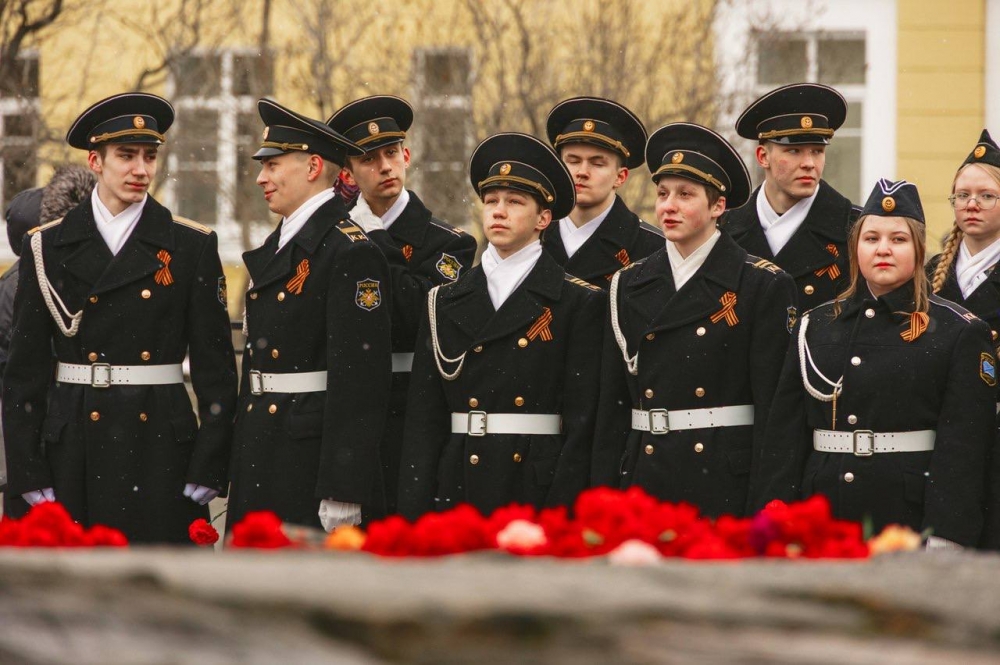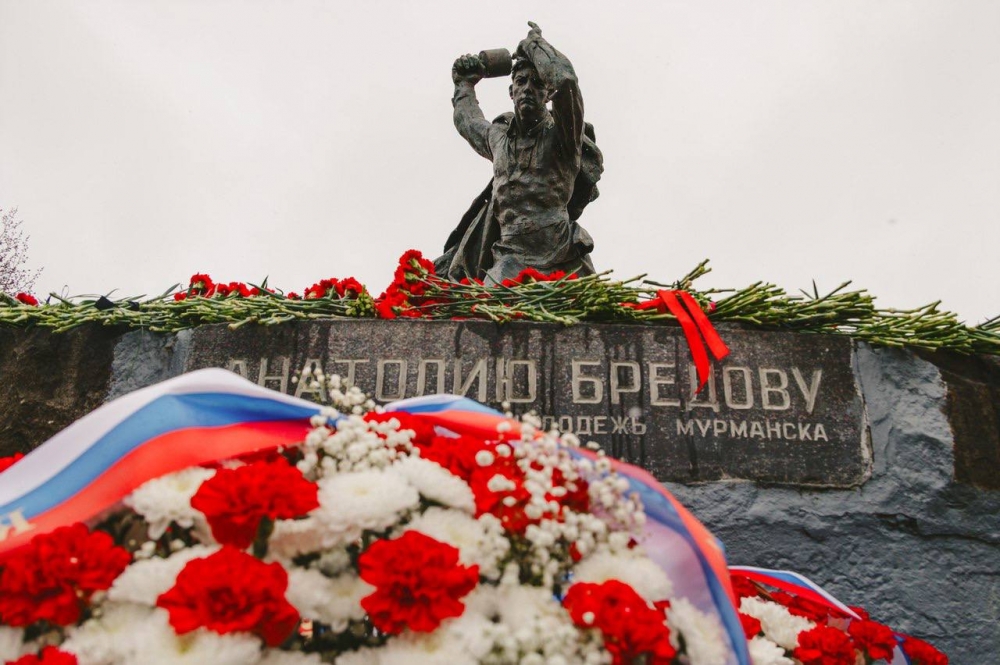 В 9:00 почетный караул заступил на пост у памятника Герою Советского Союза Анатолию Бредову, где собрались представители органов власти, военнослужащие, юнармейцы, кадеты и рядовые мурманчане. На комфортабельных автобусах к монументу доставили ветеранов, которым оказывали поддержку волонтеры Победы.