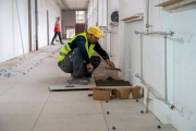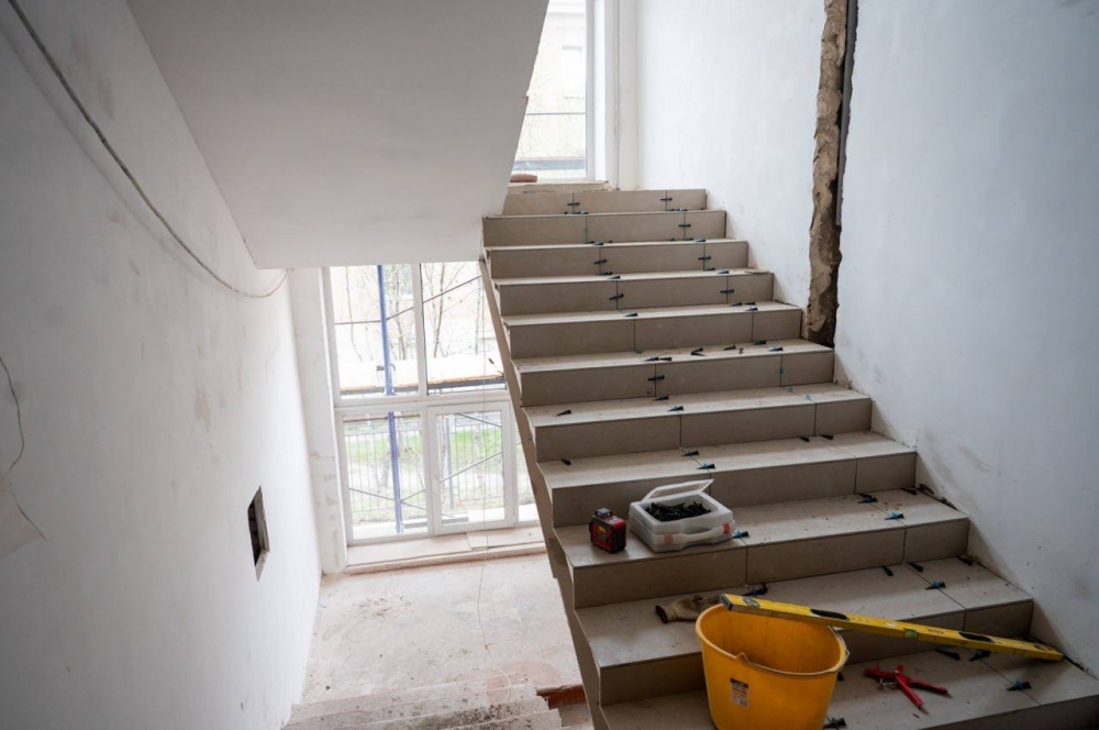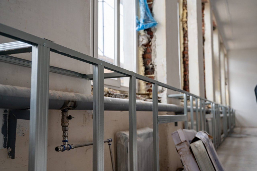 Гимназия № 5 (ул. Карла Маркса, 13) построена в 1961 году и за 64 года ни разу капитально не ремонтировалась. На сегодняшний день рабочие заняты подготовкой фасада. Затем стены будут оштукатурены, покрыты утеплителем и окрашены. Одновременно идет реконструкция инженерных сетей. Внутри здания полы и стены готовы к чистовой отделке. На 1 этаже и лестнице ведется укладка плитки и монтаж профиля под потолки.