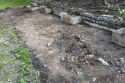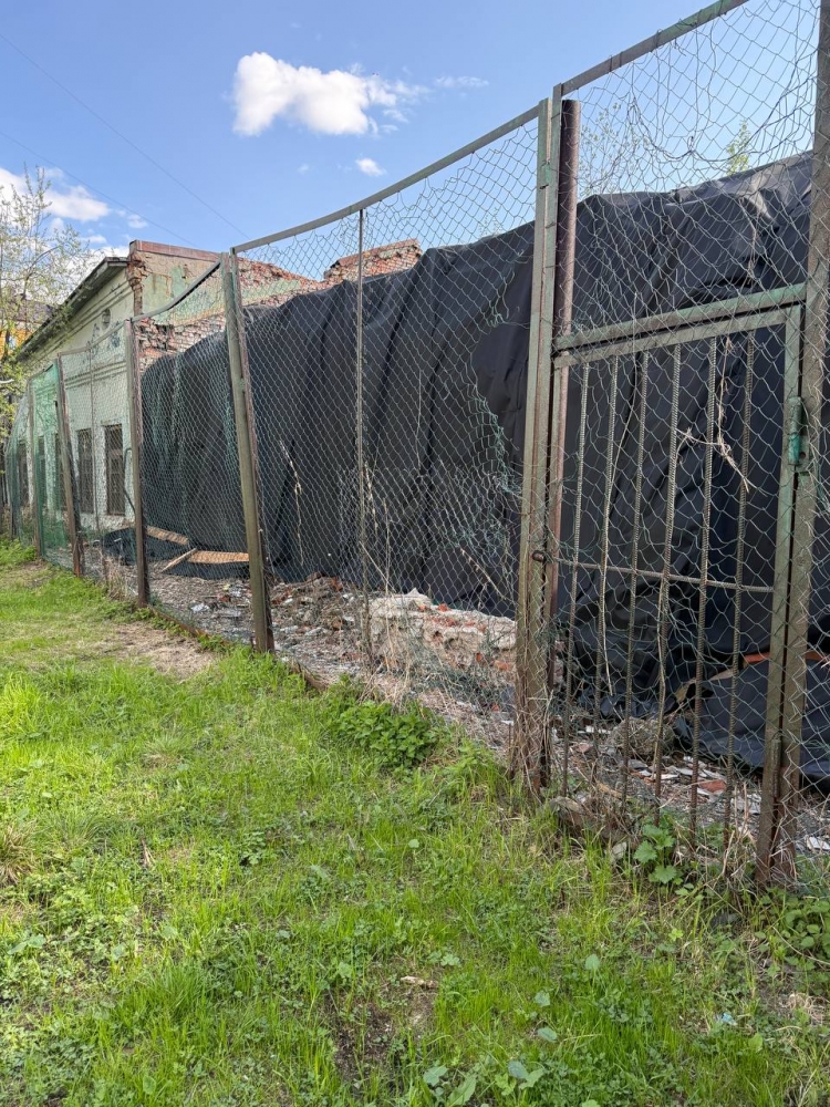 На сегодняшний день упавшие плиты забора убраны со стороны детской площадки. Мусор, находящийся за ограждением, вывезен, аварийная крыша разобрана, каркас из каменных стен закрыт. Собственником запланирована дальнейшая уборка мусора и восстановление ограждений.