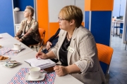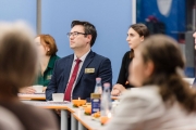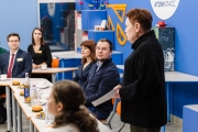 Гостю был продемонстрирован кабинет-трансформер со сдвижной перегородкой и магнитными стенами. Затем за чашкой чая состоялся разговор с учителями, преподающими в Атомклассе.