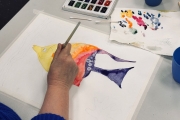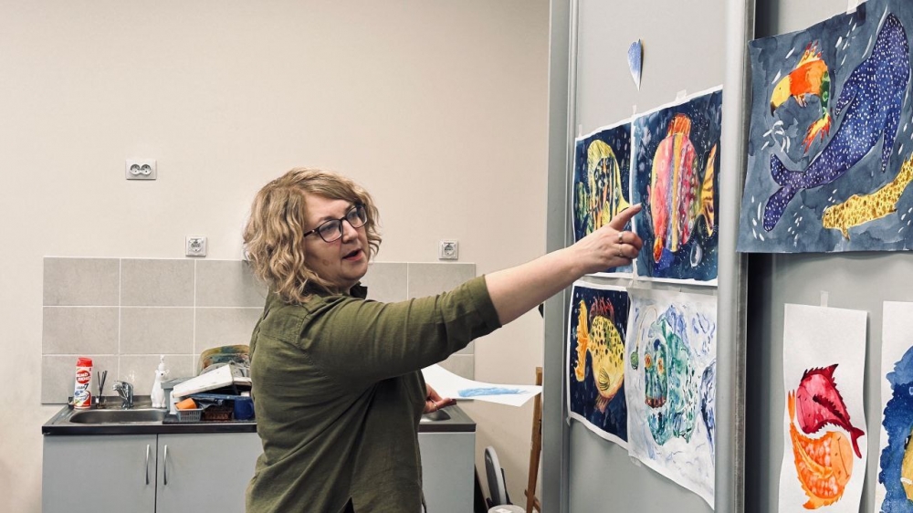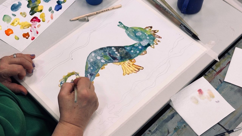 В ходе урока участники рисовали подводных обитателей — рыбок и других морских существ. Работа велась в особой технике, при которой цвета плавно перетекают друг в друга прямо на листе, формируя естественные объёмные градиенты.