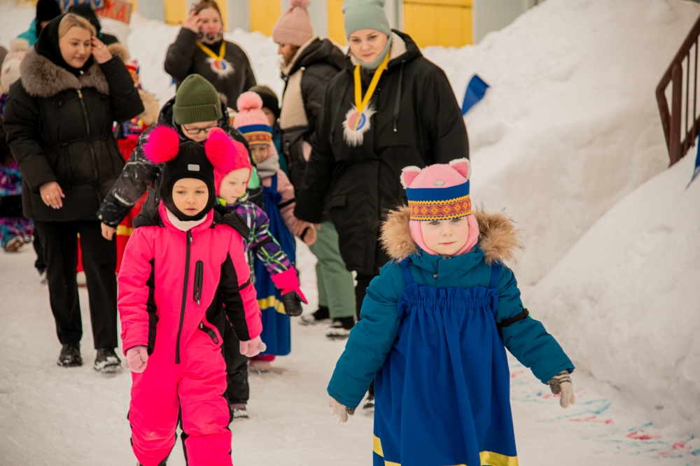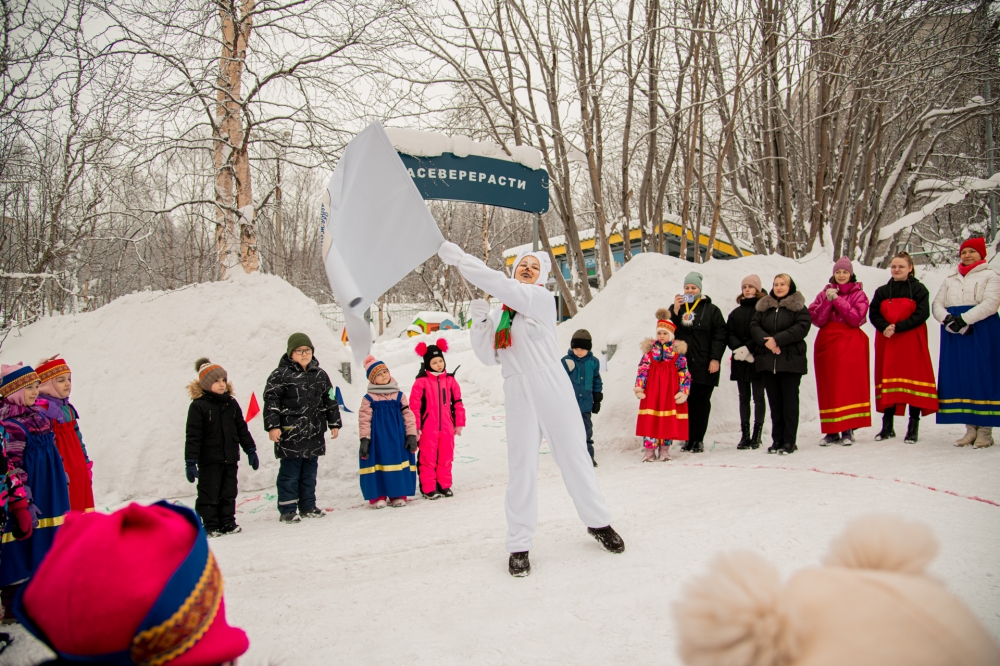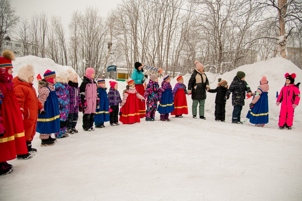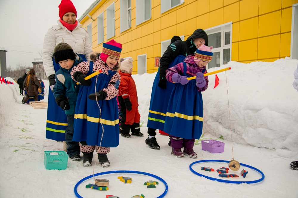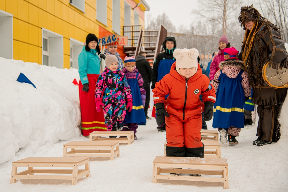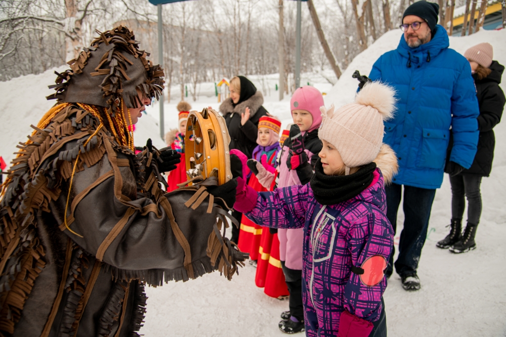Сегодня в честь открытия фестиваля в детском саду № 73 (ул. Юрия Гагарина, 10) состоялся праздник, посвящённый Году единства народов России. Воспитанники старших групп и их родители встретились с талисманом фестиваля — Белым мишкой, а затем вместе с Шаманом отправились в путешествие по саамской деревне. Ребята приняли участие в традиционных подвижных играх, таких как «Ловля рыбы» и «Прыжки через нарты», а также сыграли в саамский футбол.