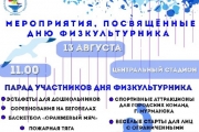 13 августа в 11.00 на Центральном стадионе профсоюзов (ул. Челюскинцев, 1) состоится парад участников Дня физкультурника. Также в программе праздника: эстафеты для дошкольников, соревнования на беговелах, «Пожарная тяга», соревнования по баскетболу «Оранжевый мяч», спортивные аттракционы для городских команд, веселые старты для лиц с ограниченными возможностями здоровья.