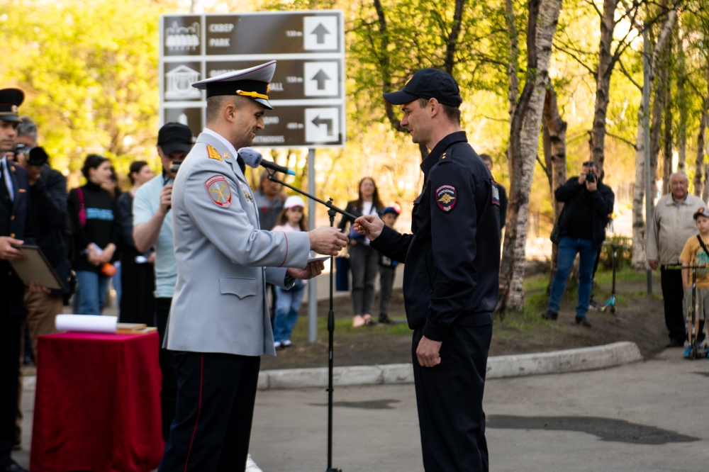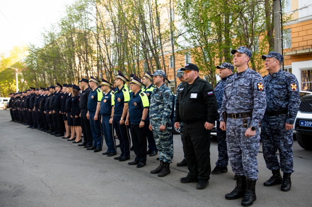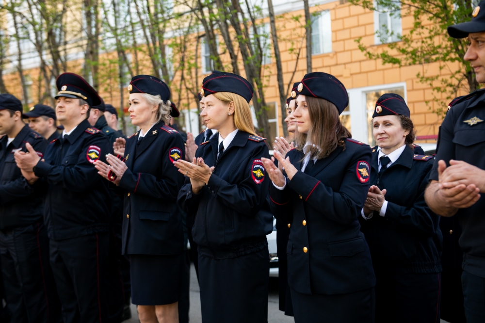 В честь этого события на улице Воровского выстроились личные составы комплексных сил и средств подразделений УМВД России по городу Мурманску и УМВД России по Мурманской области.