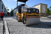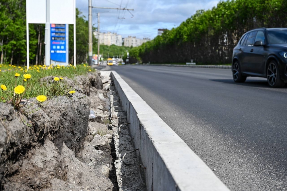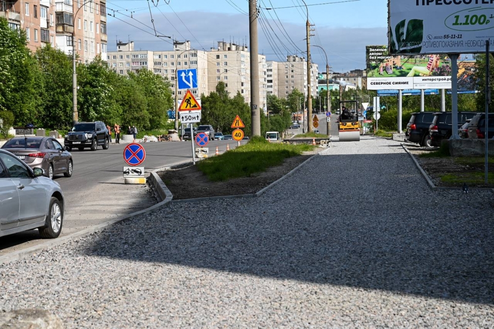 На проспекте Кольском рабочие заканчивают работу над обустройством новых тротуаров, устанавливают бордюрные ограждения, после чего перейдут к озеленению. Здесь объем работ достиг уже 83%.